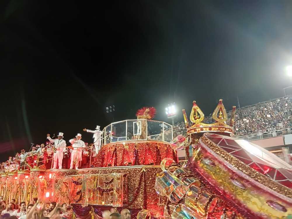 A bateria da Viradouro, comandada pelo enredo Ciça, encerra o desfile campeão em cima da última alegoria (Foto: Carlos Fonseca/SAMBARIO) ' O campeonato da Viradouro, sua quarta conquista no Grupo Especial em quase 30 anos, se banha de todos os méritos e justiça por unir emoção e técnica em um só desfile, ao ponto de as arquibancadas já proclamarem o grito de “é campeã!” para a escola de Niterói antes mesmo da apresentação acabar – particularmente, em seis anos cobrindo desfiles in loco, nunca tinha visto algo que chegasse perto disso. Desde o anúncio do enredo eu destacava durante os programas de pré-carnaval do SAMBARIO que “a Viradouro tem a chance de fazer algo histórico com essa homenagem pro Ciça”. E fez. Além do que se podia imaginar.