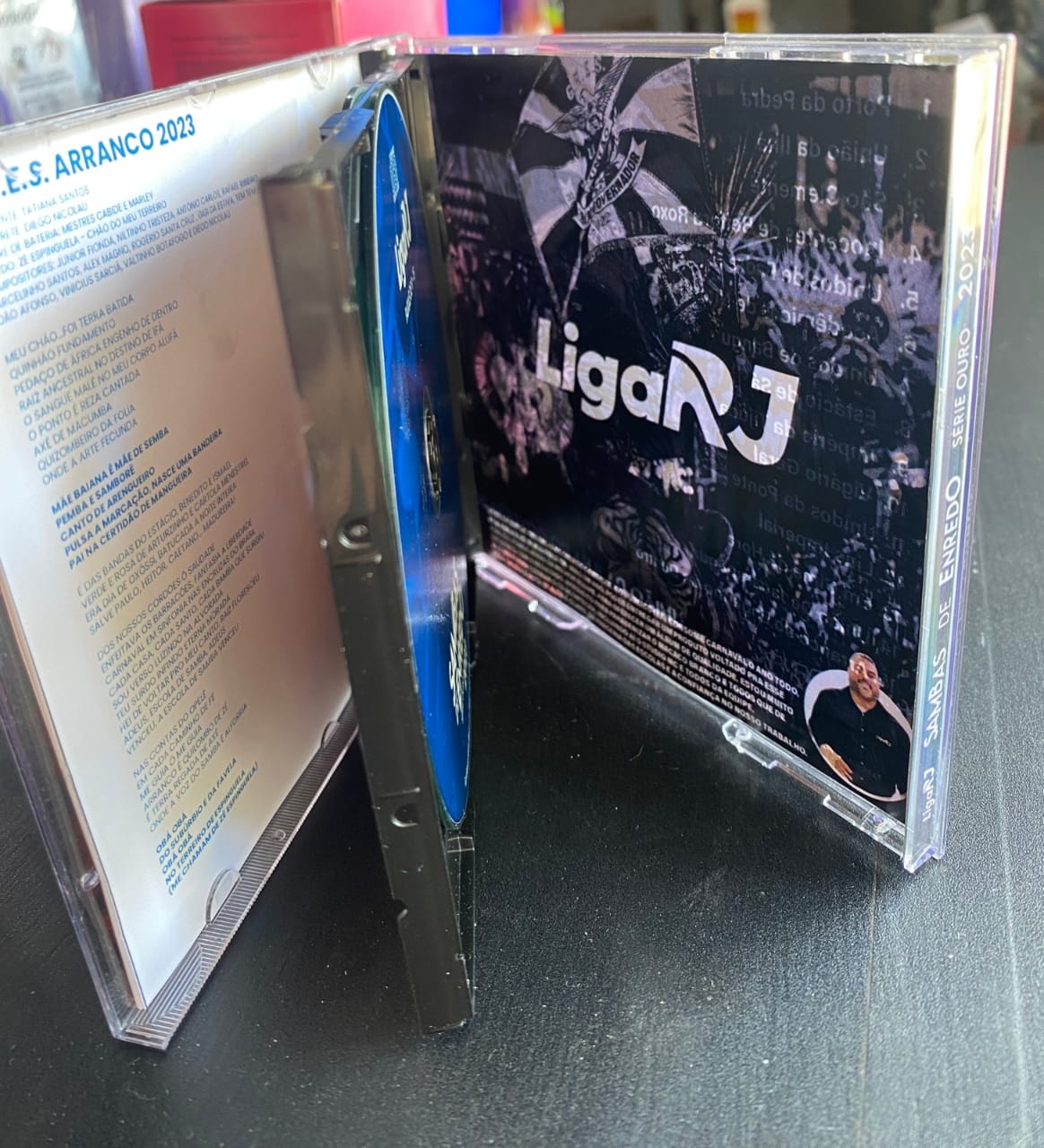 CD e copo personalizado em sacos pretos No último dia 6 de janeiro, a Liga RJ anunciou a comercialização do CD físico duplo da Série Ouro 2023. Entretanto, seria necessário entrar em contato com o WhatsApp disponibilizado pela liga. Além do disco, também foi colocada a opção de adquiri-lo num combo, junto com um copo personalizado. O recipiente a ser escolhido podia ser de cada uma das 15 escolas ou com os símbolos de todas. Optei pelo CD mais o copo com os 15 brasões, pagando 60 reais, mais o frete para Porto Alegre, é claro. Se quisesse somente o CD, o preço era de 48 reais. A Liga RJ informou a chave do PIX, mas não comunicou uma previsão inicial de envio. Logo, conhecidos meus ficaram na dúvida se efetuavam ou não a transferência. Paguei no dia 9 de janeiro e só obtive um retorno do zap da entidade no dia 27. Ou seja, 18 dias depois. Então, a Liga RJ me enviou a seguinte mensagem, com duas fotos do CD, dessa vez em capa de acrílico ao invés de papelão, reproduzidas mais abaixo: "Olá! Estamos na etapa de recebimento dos pedidos. A partir de 2/2, começaremos a distribuição. Nosso portador, responsável pelas entregas e pelos Correios, entrará em contato para passar as demais informações. Obrigada!".
