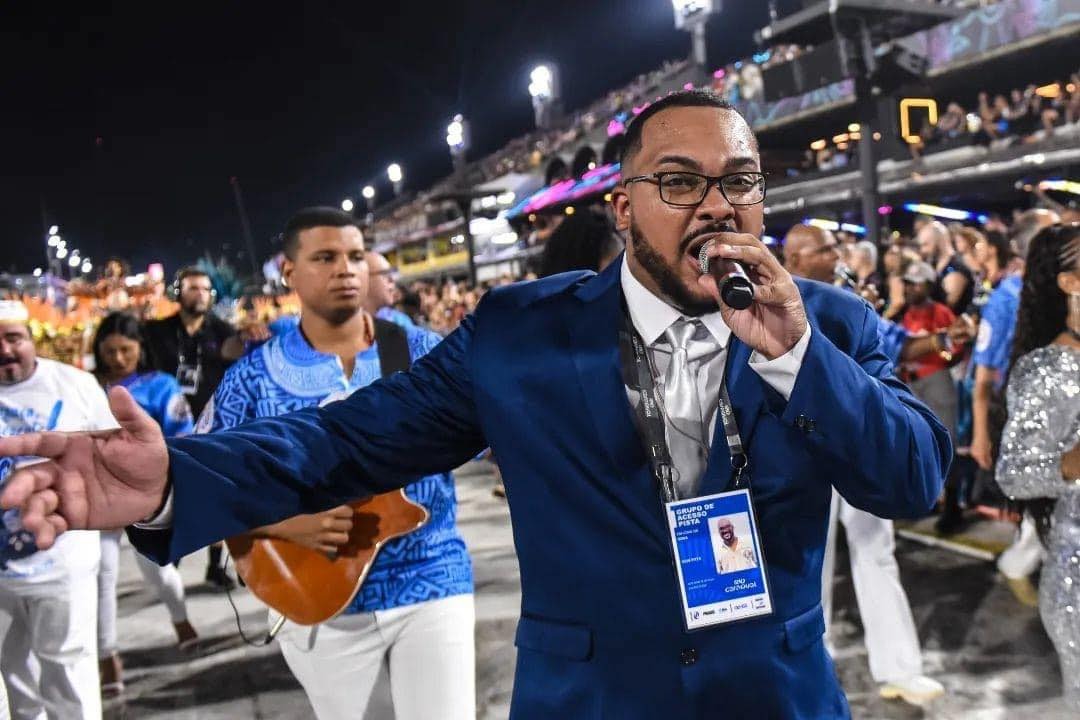 Intérprete oficial da ECDH soltando o gogó na Sapucaí em 2023