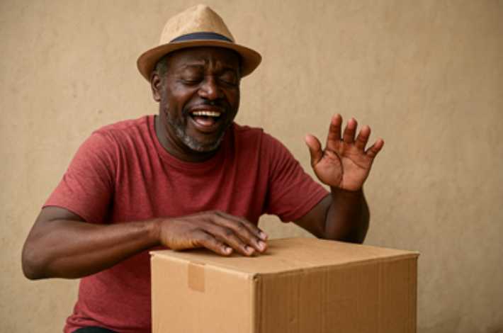 caixa de papelão, com mão batendo na mesa, palmas, e