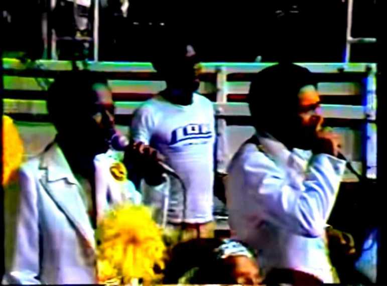 Abílio Martins (com microfone, à esq.) cantando ao lado de David Correa no desfile da Portela em 1980.